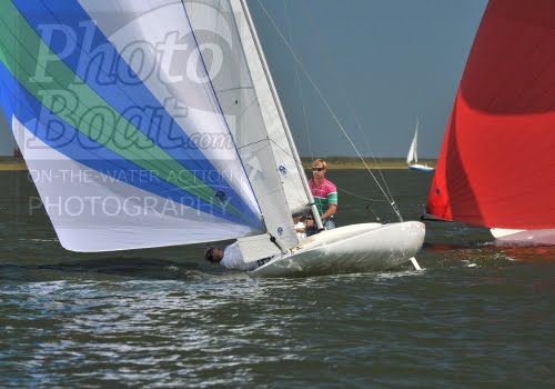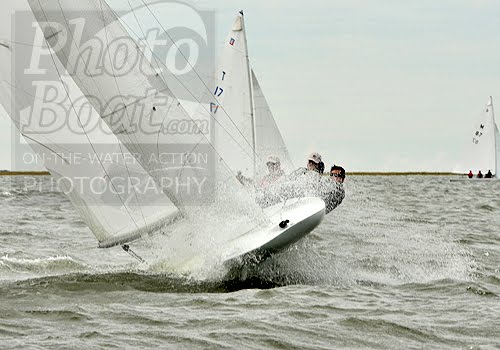 70 E-Scows gathered at Little Egg Harbor Yacht Club this past weekend for three days of extremely varied sailing conditions (Fri: NW 15-20, Sat: NE 5-10, Sun: rain, no wind) and two days of similarly varied post-sailing activities and attire (Fri: formal banquet, Sat: pirate party). The club volunteers spared no effort to put together a memorable Nationals for the class. We got some exciting shots in the big breeze on Friday, and capture